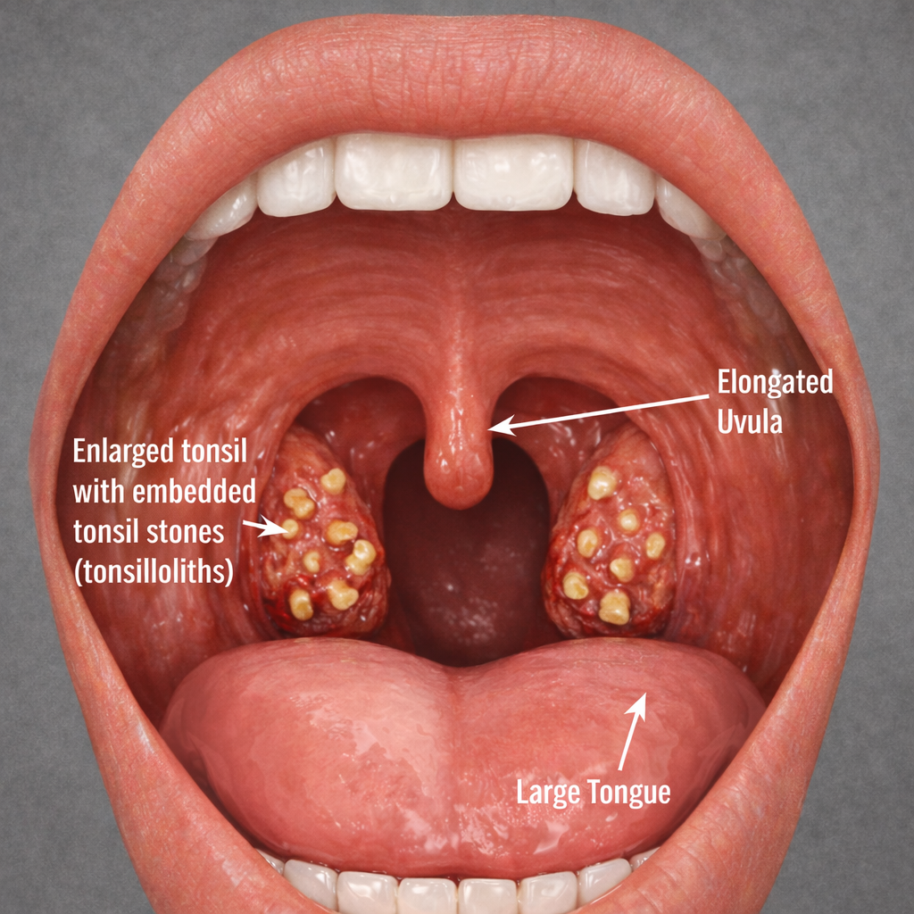 - Recurrent tonsil stones (tonsilloliths) that form frequently or are difficult to remove